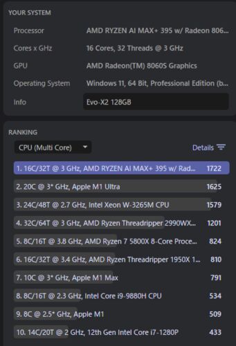 Cinebench 2024 マルチコアスコアは1722でした。結構早い。 3D Mark 軽量のデモ Steel Nomad Light の結果が 8142。手元に比較対象ないので相対感はわかんないけど、数字的にはRTX3060くらいらしい。Radeon 8060Sくん。 世の中の評判見てても、Evo X2のGPUパ…